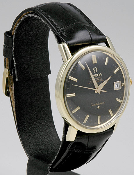 Lovely re-finished black dial with applied gold 'baton' type hour markers, matching 'dauphine' hands and raised Omega symbol. Dial is signed 'Omega Automatic Chronometer Officially Certified, Constellation' with 'Swiss Made' at 6 o'clock.