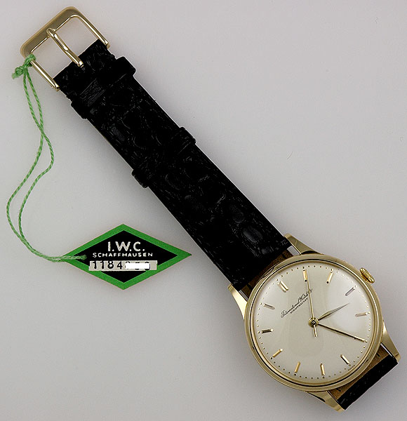 Gentleman's International Watch Company wrist watch (now known simply as IWC) in solid 18ct yellow gold with original silver dial and black leather strap. Complete with original manufacturer hang tag - true 'New/Old Stock' condition.
