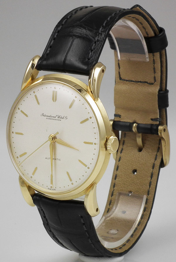 Original silver dial is in excellent condition with applied gold baton hour markers and matching gold hands with sunken minute markers around the outside. Dial is signed 'International Watch Company, Schaffhausen', 'Automatic' with 'Swiss' at 6 o'clock.