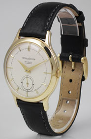 Stunning 9ct yellow gold Jaeger LeCoultre wrist watch with white sub-seconds dial and soft, black leather Hirsch strap. Beautiful condition. 'Bumper' automatic. Very rare to find an automatic with a sub-seconds dial; especially with a bumper movement.