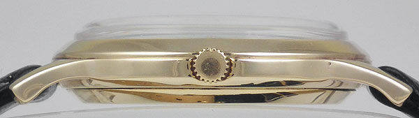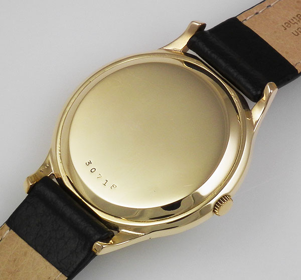 Stunning, solid 9ct yellow gold case is in lovely condition with smooth bezel and elegant shaped lugs. Partially sunken winding crown; could well be original to the watch. This is a so called 'contract case'. The rear cover has the serial number: 30718. Hallmarks inside rear cover denoting 9ct and date letter for 1959.