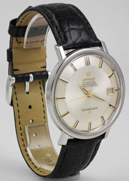 Gentleman's Omega Constellation in stainless steel with stunning silver dial and black leather Hirsch 'Regent' strap with complementing steel buckle. This is the date version - calibre 561.