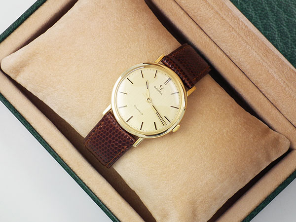 Gentleman's Omega 9ct yellow gold Geneve in lovely condition with original 'linen' champagne dial and brown lizard strap. Very pretty watch.