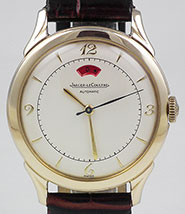 Really crisp, recently refinished antique silver (almost white) dial with 'dagger' batons and Arabic numbers at 12, 3, 6 & 9 o'clock. Power reserve indicator at 12 o'clock enables you to see precisely how much running time is left on the mainspring. Dial is signed "Jaeger LeCoultre, Automatic" with "Swiss Made" at 6 o'clock.
