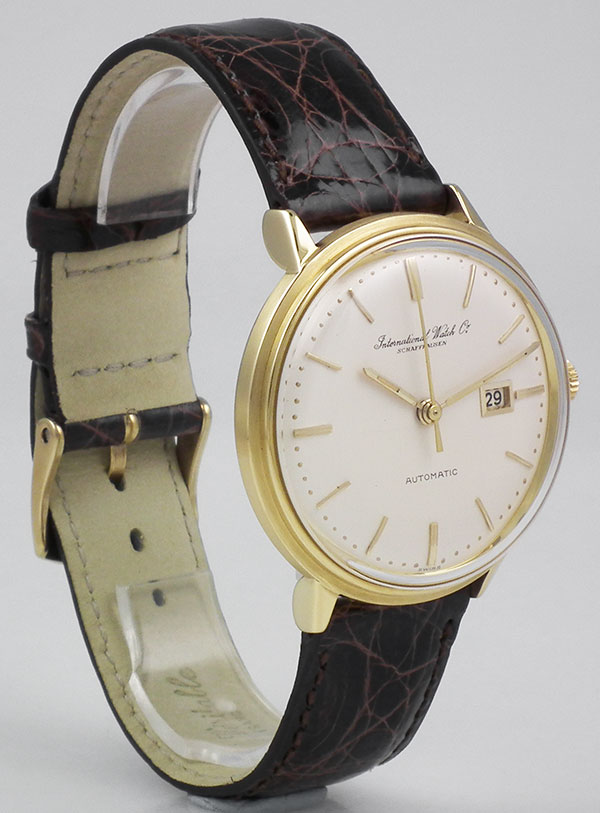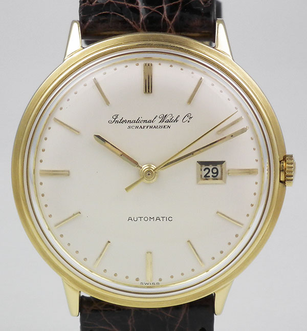 Recenly refinished white dial is in excellent condition with applied gold baton hour markers and matching original gold hands. Dial is signed 'International Watch Company, Schaffhausen', 'Automatic' with 'o Swiss o' at 6 o'clock. Dial also has date window at 3 o'clock. Date feature/complication works perfectly.