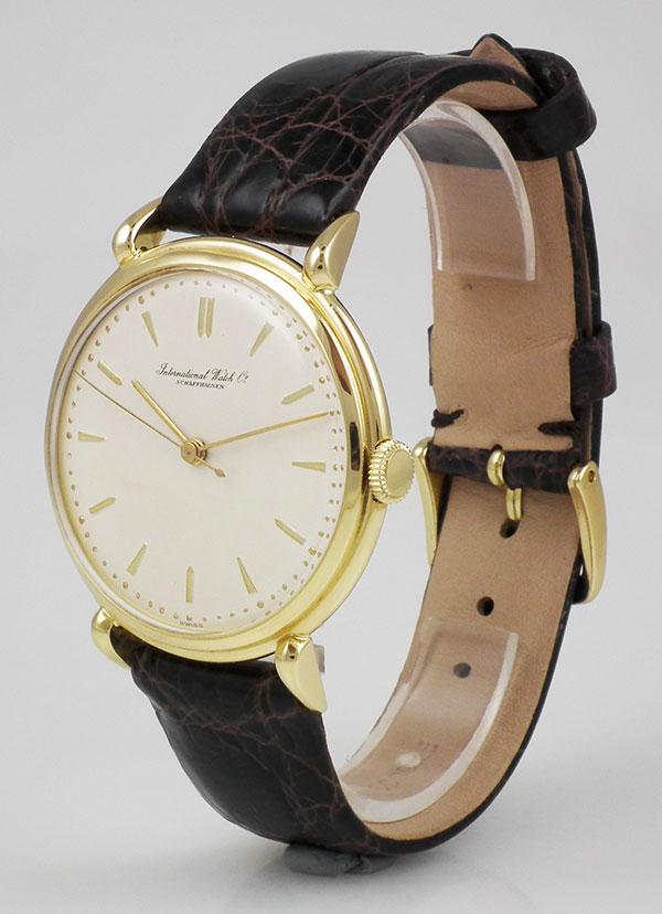 Beautifully re-finished white dial is also in flawless condition with applied gold 'baton' hour markers and matching 'stick' type gold hands. Dial is signed 'International Watch Company, Schaffhausen' with 'Swiss' at 6 o'clock.