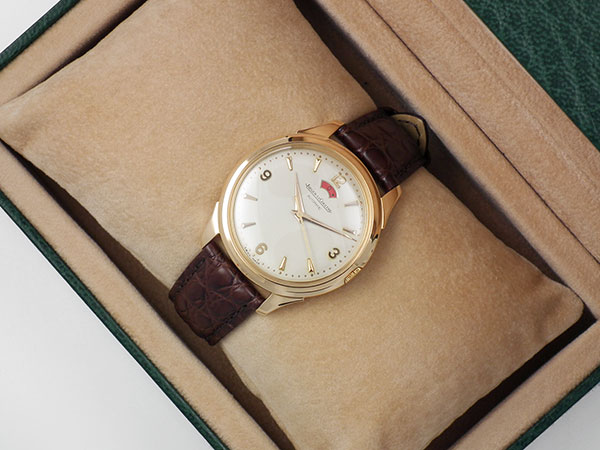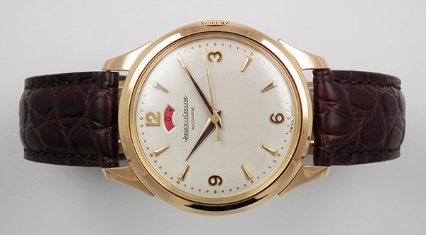Gentlemen's Jaeger LeCoultre automatic in stunning 18K pink gold case with power reserve (colour change) indicator. Truly mint condition and extremely rare with its original dial. A superb investment piece.