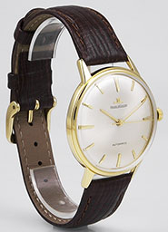 Lovely original silver dial is in excellent condition with chunky yellow gold 'baton' type hour markers and matching original yellow gold 'stick' hands. Dial is signed "Jaeger LeCoultre, Automatic" with "Swiss Made" at 6 o'clock.