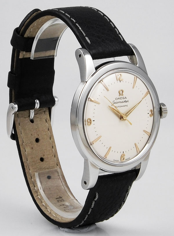 Lovely refinished white dial is in flawless condition with original gold 'dauphine' hands and matching yellow gold 'dagger' type hour batons with applied numbers at 3, 6 & 9 o'clock. Dial is signed 'Omega Seamaster, Automatic' with 'Swiss Made' at 6 o'clock.