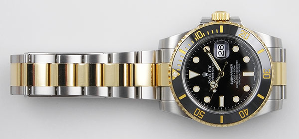 Again, near mint condition 18K/SS 'Oyster' bracelet has zero stretch/play in links at all and as with the case, only a few very light handling marks. This is the current revision 'Glidelock' bracelet which is adjustable without tools. Bracelet will currently fit approx. 8.5" wrist or can be adjusted. This is the full 'retail length' bracelet as originally supplied new. No links have been removed.