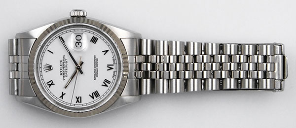 Gentleman's Rolex Oyster Perpetual DateJust with bright white Roman numeral dial and matching stainless steel 'Jubilee' bracelet (sapphire crystal, QuickSetDate model). New replacement model RRP: £6,300.