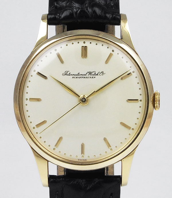 Original silver dial is also in flawless condition with applied gold baton hour markers and matching plain gold hands. Dial is signed 'International Watch Company, Schaffhausen' with 'Swiss' at 6 o'clock.