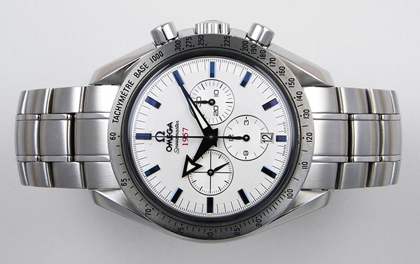Stunning white dial is perfect with no marks, discoloration or belmishes. Large 'Broad Arrow' blued steel hands with matching 'baton' hour markers. Chronograph registers at 3, 6 & 9 o'clock with date aperture also at 6. Dial is signed "Omega Speedmaster 1957" with "Swiss Made" at very bottom.