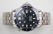 Description: Gentleman's Omega Seamaster Quartz (full size) in stainless teel with 'James Bond' blue dial and bezel. Complete with original boxset, manual, hangtag and warranty cards...