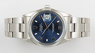 Description: Rolex Oyster Perpetual Date finished in stainless steel, with beautiful dark blue metallic 'Sunburst' dial & matching stainless steel 'Oyster' bracelet (QuickSetDate model). Excellent original condition with full retail length bracelet, boxset, original warranty certificate and lots of service paperwork, etc...